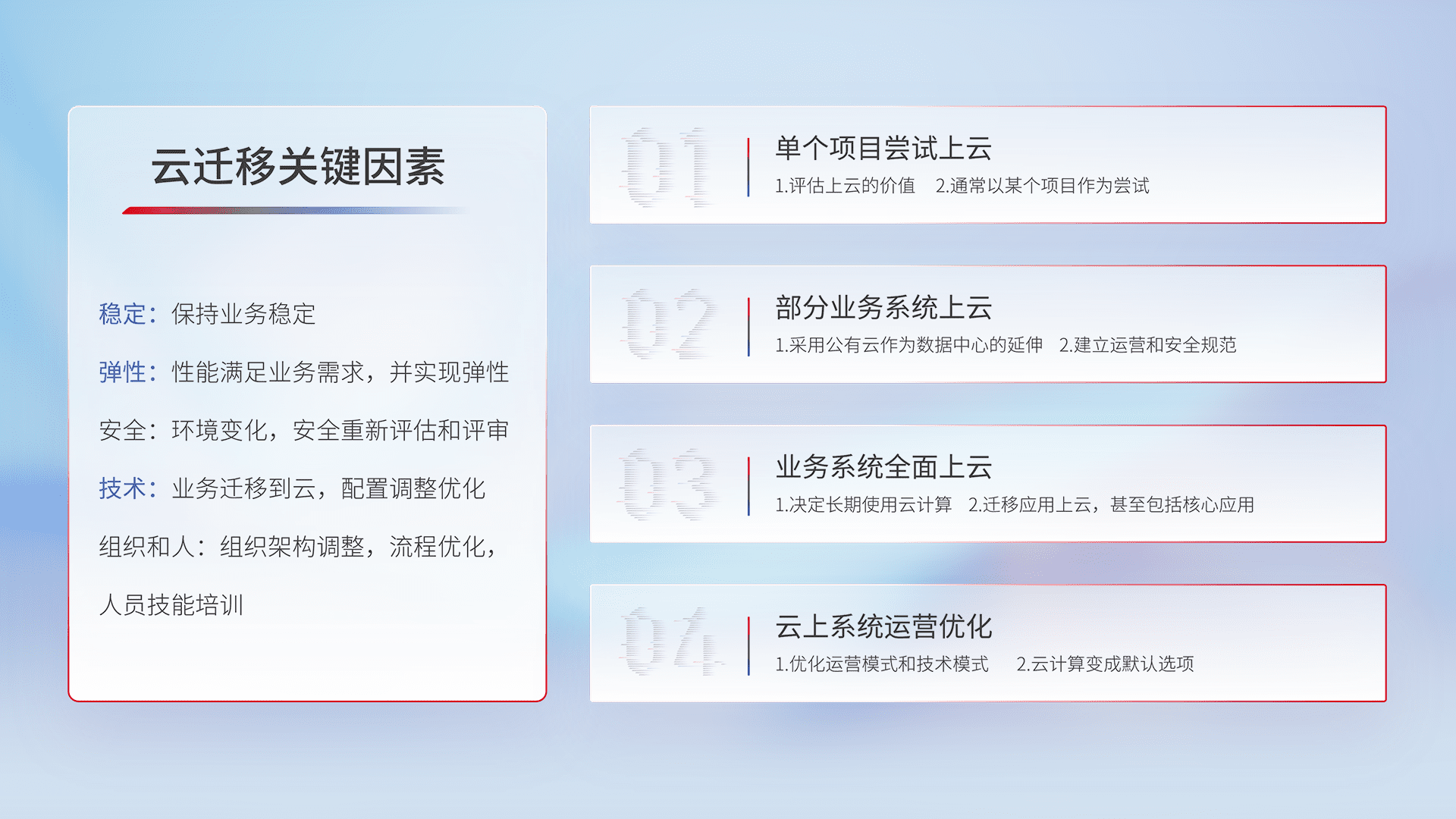 结合实际业务,,,从规划设计、、、云平台选型、、云原生改造、、数据迁移、、集成交付,,迁移全过程为客户识别最佳上云路径,,,,做好风险识别管理,,,设计网络架构、、、身份权限、、、、安全审计合规、、、操作审计、、日志审计、、、监控告警策略、、、、多站点容灾设计等,,,对云上基础设施进行整体规划,,,提升IT治理水平,,,,以满足弹性、、高可用、、、、高性能的需求。。。