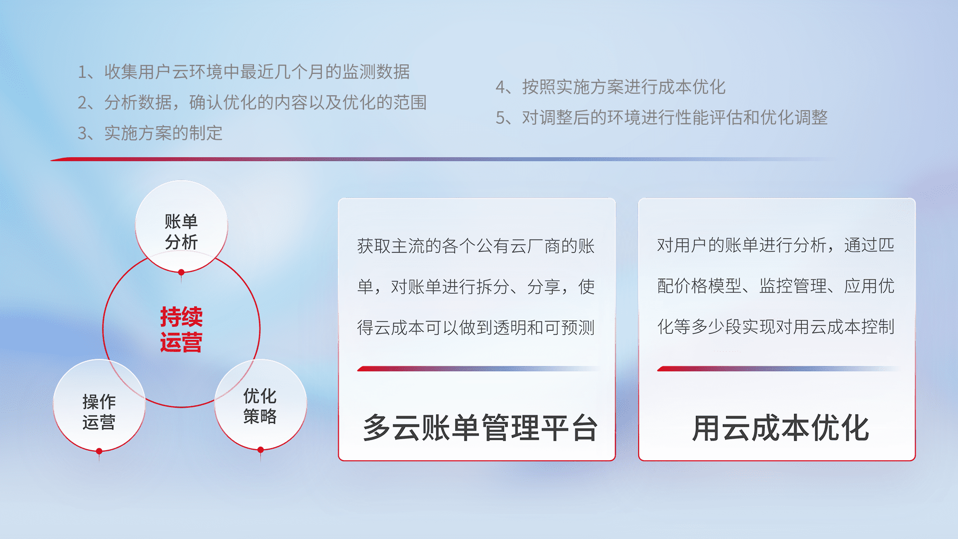 通过多云纳管,,以统一的资源数据模型把客户的云资源进行抽象和封装,,,,进而实现对多云资源的统一操作,,,,保障云资源管理的可靠性、、、、稳定性与可用性。。。量身定制化运维内容,,,配置、、、开发运维、、、、补丁管理、、、备份、、、监控、、、、认证和访问管理、、、审计和日常巡检等,,,,保障在用云过程中的可靠度,,稳定度以及高可用率。。。